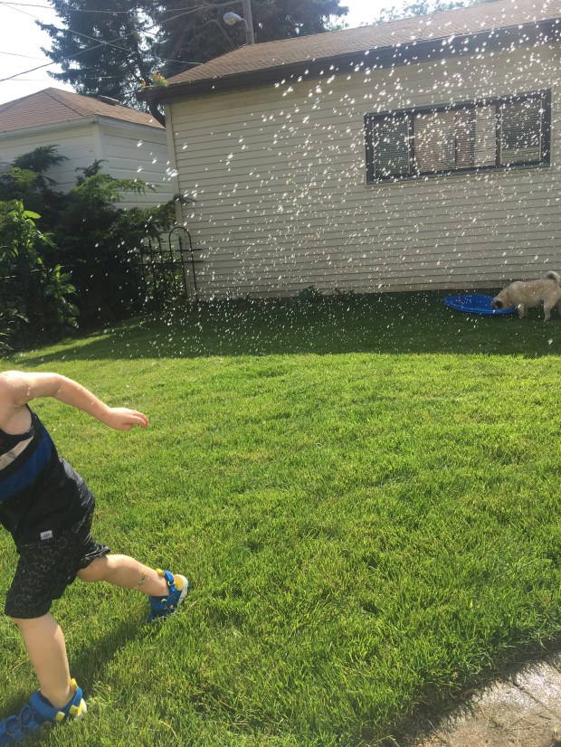 Now the sprinkler’s running, and he’s chasing after their neighbor. They zip and zag through matted grass. They spin and twirl under an arch of droplets, little bodies shaking with laughter. It seems deliciously sinful to be sitting here under the sun, with no agenda whatsoever. When was the last time she felt this way? A giggle rises in her belly. She cannot remember.